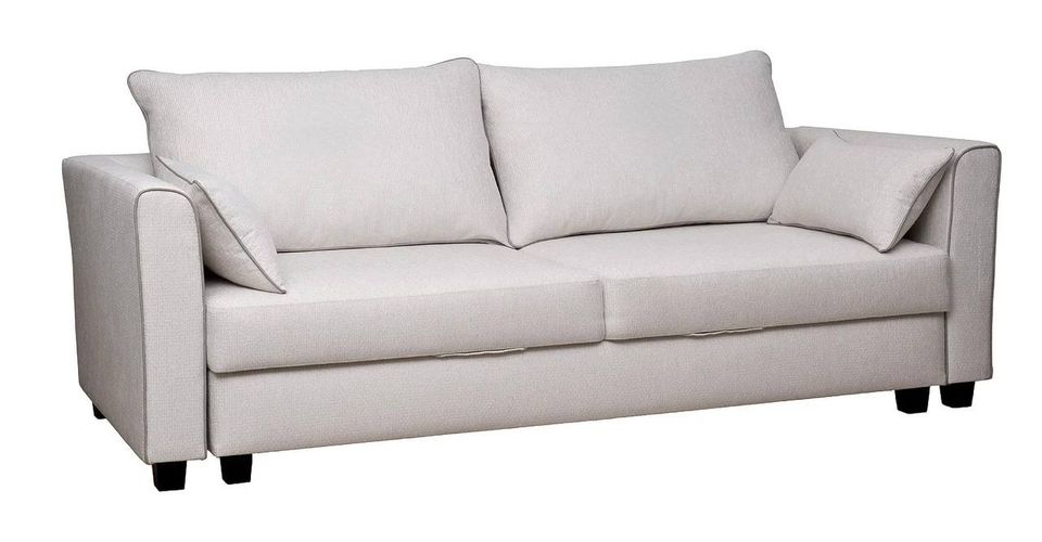 Раскладной трехместный диван станет центральным украшением гостиной. Он гармонично сочетает функционал мягкого спального места и красивого предмета интерьера. За счет механизма-трансформера «пума» этот светло-серый диван превращается в удобное спальное место для двоих человек. Прочность и долговечность мягкой мебели обеспечивает каркас из натуральной древесины, а эстетику – обивка из рогожки, диванные подушки с вышивкой, светлая цветовая гамма. Это прекрасное решение для интерьеров в стилистике арт-деко, контемпорари, классика, минимализм. В стандартном исполнении обивка из тканей коллекций: основная ткань- Koza2601-ECRU, кант- иск.кожа Nevada 21,цвет ножек - 4.В комплект входят две подушки спинки + 2 декоративные прямоугольные подушки у локтей.