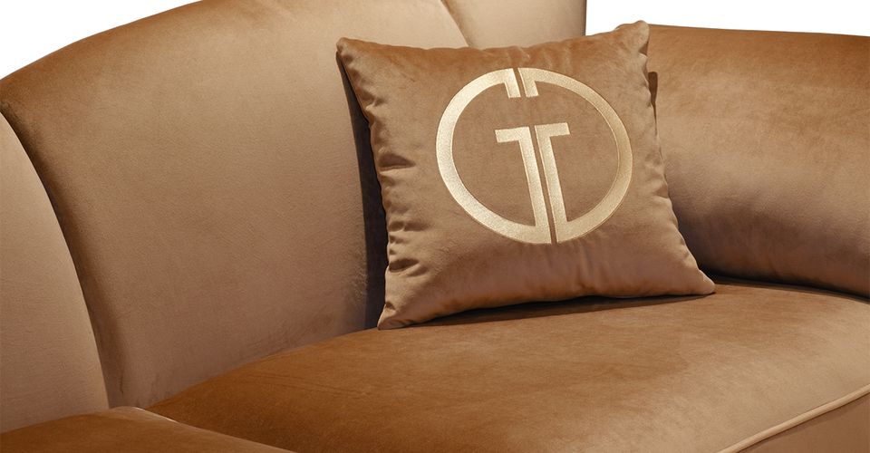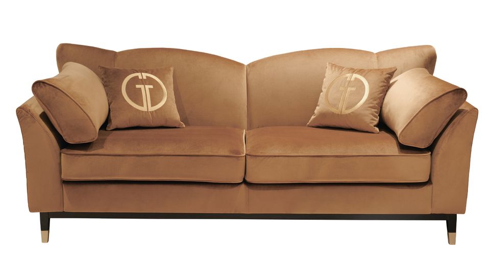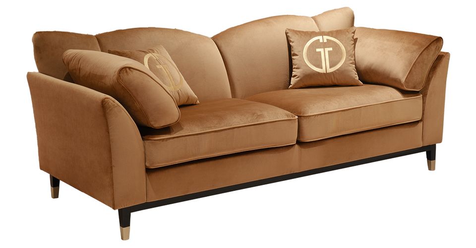 Трехместный диван – идеальное сочетание безупречного качества, элегантной эстетики и функциональности. Легко и непринужденно вписывается в стилистику арт-деко, шебби-шик, неоклассика. Стильный велюровый диван легко найдет себе место в гостиной, студии, кабинете, холле. Для повышенного комфорта и поддержки спины предусмотрены спинка необычной формы, мягкие подлокотники и диванные подушки с красивой золотой вышивкой. Ножки с отделкой цвета золото подчеркивают роскошную эстетику золотого дивана. Диван трехместный без механизма трансформации в стандартном варианте выполнен в ткани коллекции Colton004, каркас и опоры - массив дерева, нижняя часть опор покрашена золотой краской. В стандатный комплект дивана входят 2 конусовидные подушки 66*30см у локтей, 2 декоративные прямоугольные подушки 40*40см.