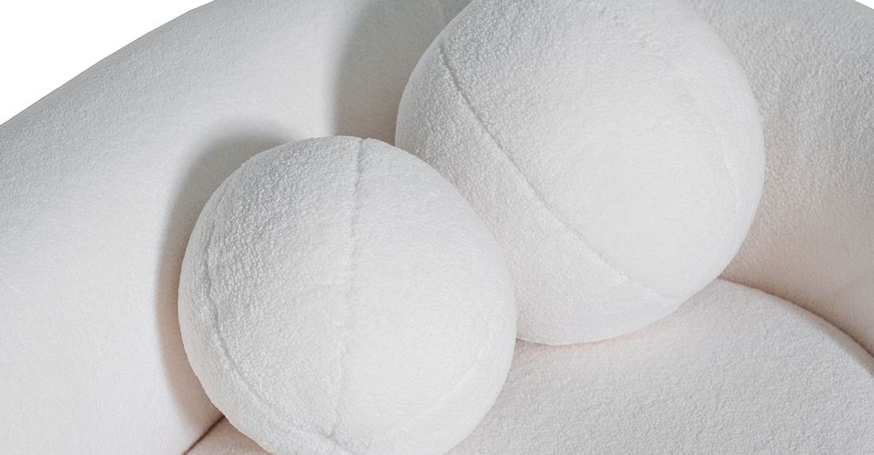 Уютный белый диван футуристической формы выполнен из мягкой обивки, по фактуре напоминающей овечью шкуру. Оригинальные мягкие выпуклые объемы внешней части и шаровидные декоративные подушки несомненно будут притягивать взор и позволят в полной мере воспользоваться преимуществами этого дивана как дизайнерского объекта. В комплект входят две шарообразные подушки диаметром 25 и 30см.